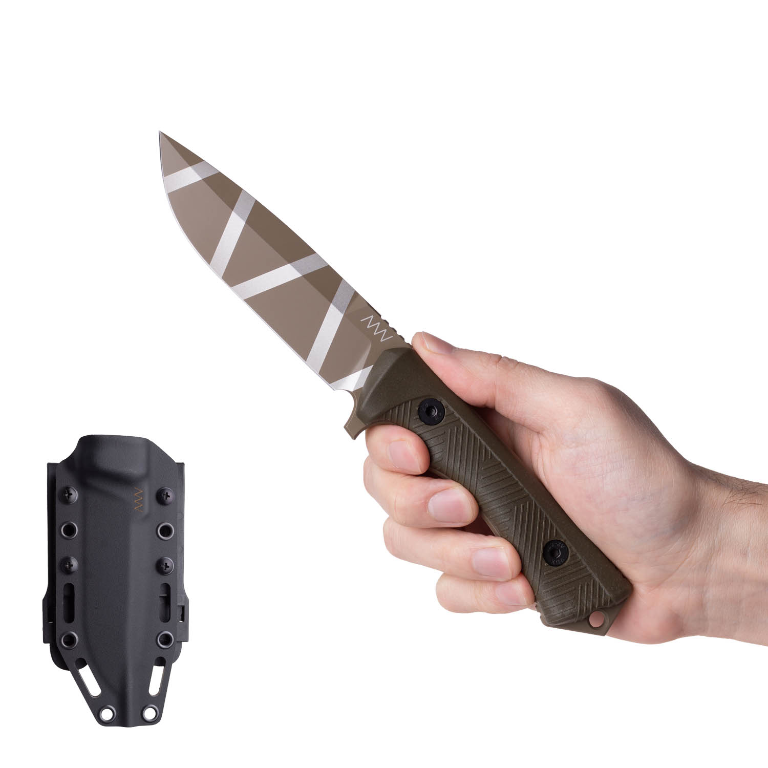 - P250 Sheath: Kydex Black, Blade: Ceracote Coyote CAMO, Handle: GRNPU Olive